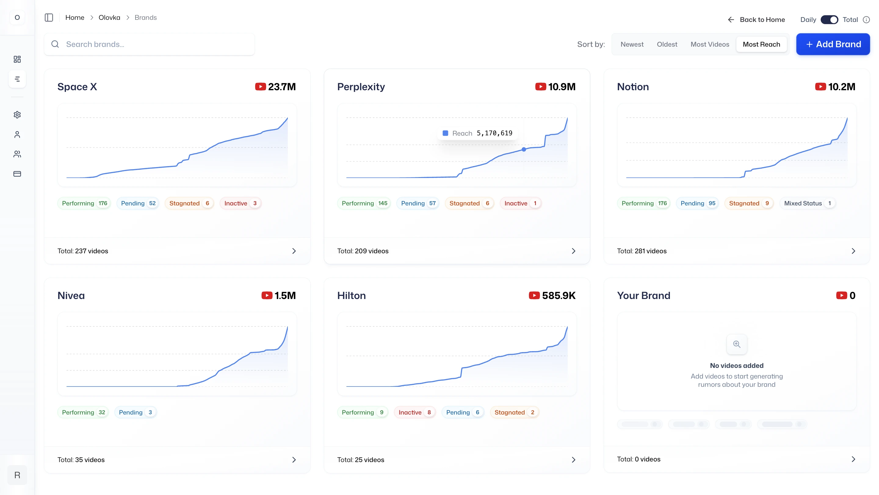 One tap away from knowing exactly how your comments drive brand searches, website traffic, and conversions from our unified video analytics dashboard from where you can add or remove videos, and generate and approve comments automatically.